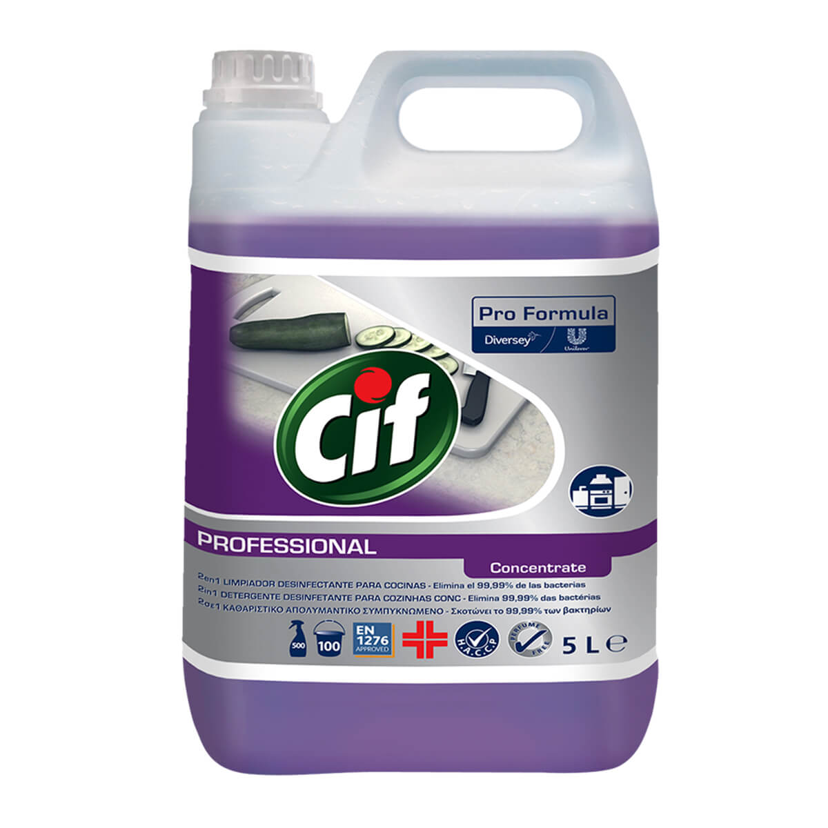 Άοσμο καθαριστικό και απολυμαντικό Cif Professional 2in1 καθαριστικό και απολυμαντικό κουζίνας για όλες τις επιφάνειες σε χώρους τροφίμων με έγκριση από τον Ε.Ο.Φ. και επιτυχή δοκιμασία στο πρότυπο EN 14476 για αντιμετώπιση κορονοϊών.
